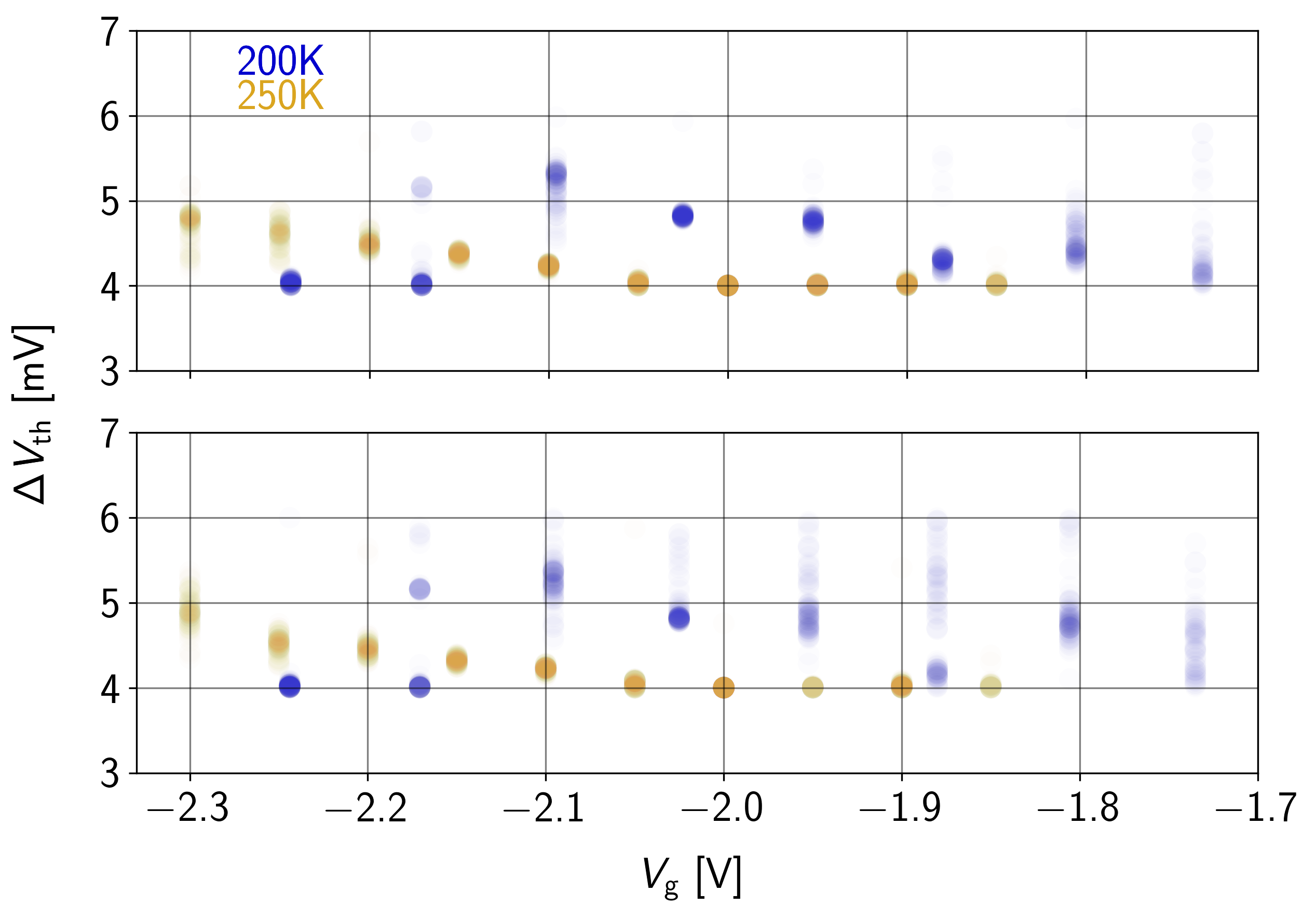The extracted step heights of the defects lie between 4 mV and 5 mV with a slightly lower average value for elevated temperatures which is in line with the values given in Figure 7.16. They also possess a slight voltage dependence with decreasing values for increasing gate bias. This can probably be explained by the fact that for a stronger channel, the screening of the defect is