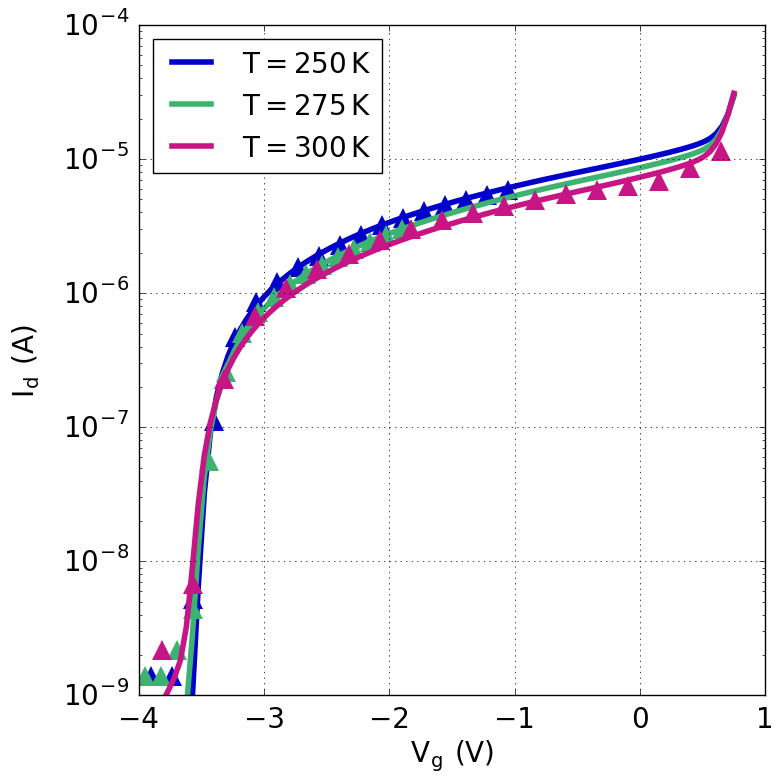 In Section 7.2.2, first the differences between regular fin FETs and the devices used in this work are laid out. The transfer characteristics of the measured device recorded at different temperatures are then used to calibrate the electrostatic device simulations.