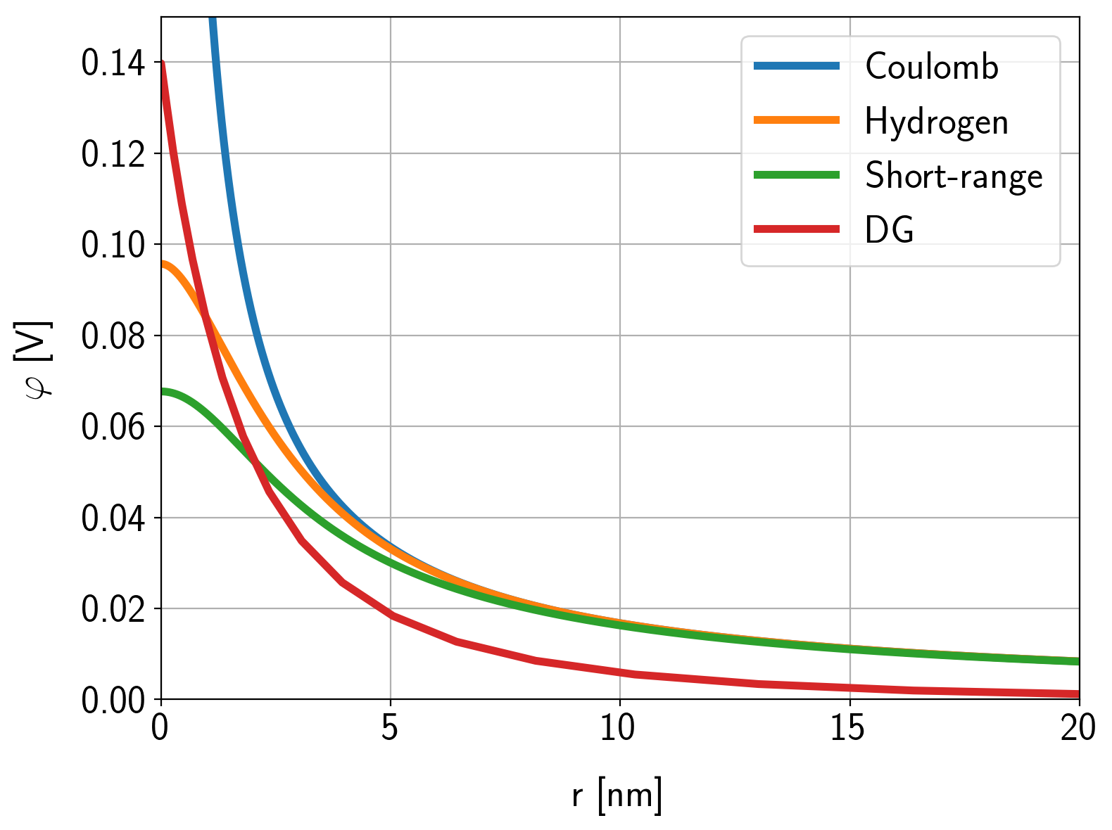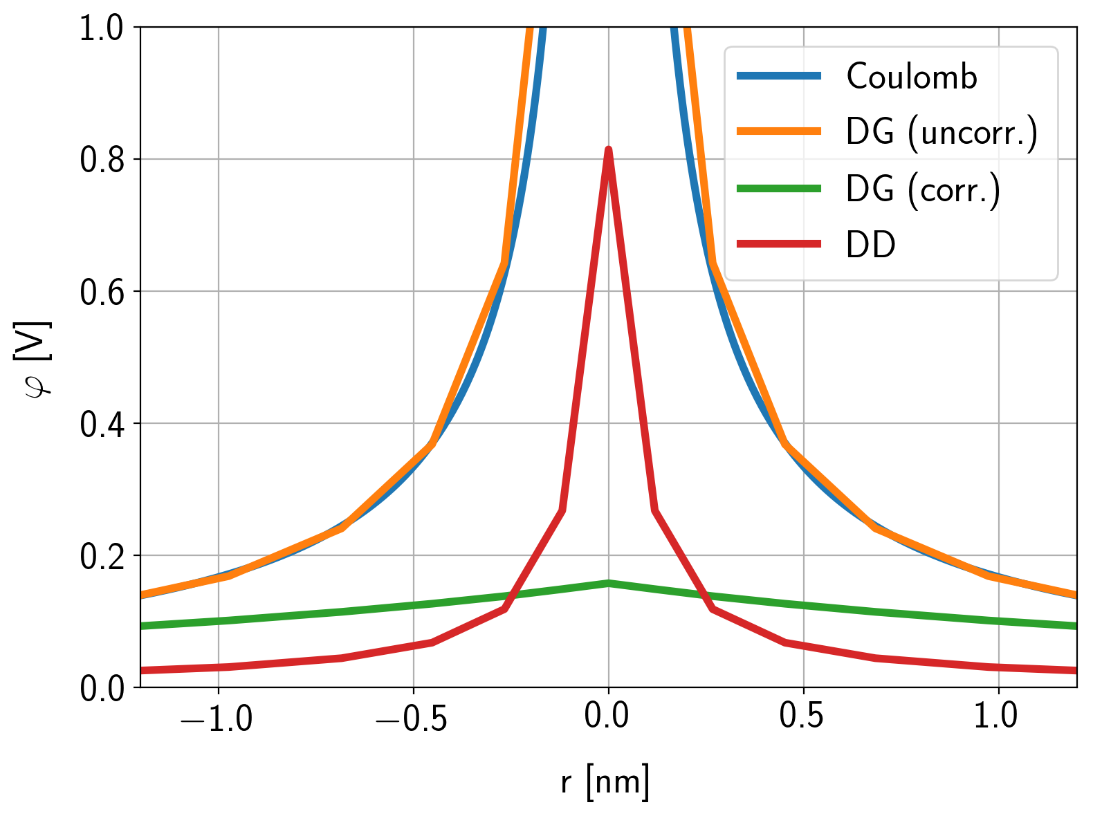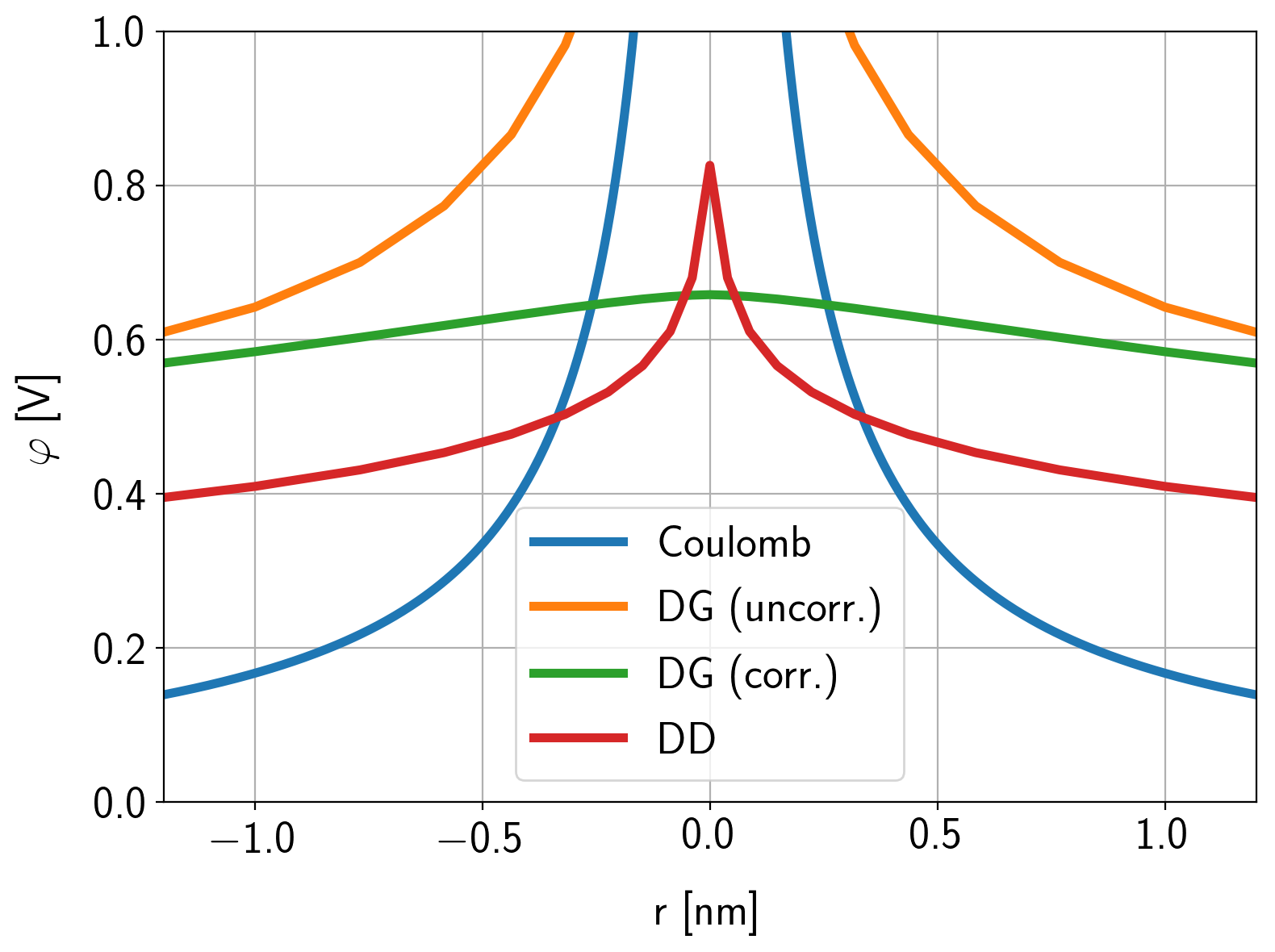 correction model like the DG model [216–218] can be used. Other approaches like the Conwell-Weisskopf model [219] divide the Coulomb potential into short-range and long-range terms, where only the long-range term enters the right-hand side of the Poisson equation. A more recent approach makes use of an analytical expression for the short-range force