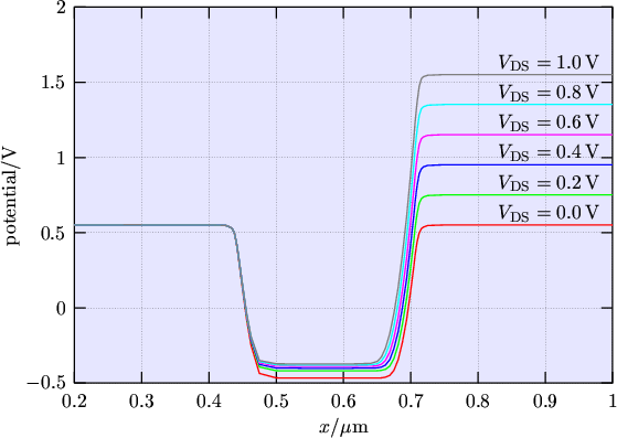 The increase of the drain current can be partially attributed to the kink-effect [58]: the holes generated by impact-ionization are drawn into the floating body where they raise the potential. Fig. 4.3 shows the lateral potential distribution in the middle of the silicon film.