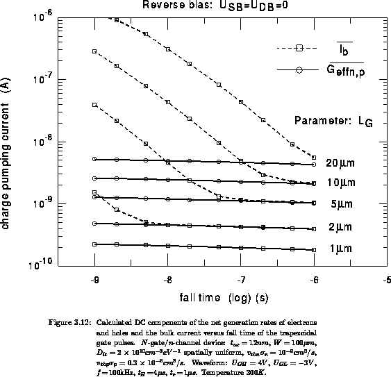 In the standard charge-pumping theory which is considered in the preceding section, it is regularly adopted that the free minority and majority carriers behave quasi-statically in MOSFETs. The only transient effects occur due to the generation and recombination through the interface and bulk traps. It has been proposed, already at the time of discovering the charge-pumping effect, that the charge-pumping current can also originates due to a finite time for removing the minority carriers out of the channel during the MOSFET turn-off, in addition to the current due to the transient generation-recombination over the traps [43]. As the time for the removing of the minorities is found to be strongly dependent on the geometry of MOSFETs, this current component is called ``geometric component'' [43]. In the measurements of trap properties, this current represents a parasitic effect. The primary interest was always to suppress it, either by using devices with a sufficiently short channel, by avoiding the application of very steep gate pulses or by biasing the source and drain junctions reversely [154][117]. A detailed study of the geometric component in the charge-pumping current is still missing. Recently, a very sensitive technique has been proposed to measure the geometric component also in the cases when the generation-recombination component largely dominates in the charge-pumping current [98].