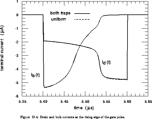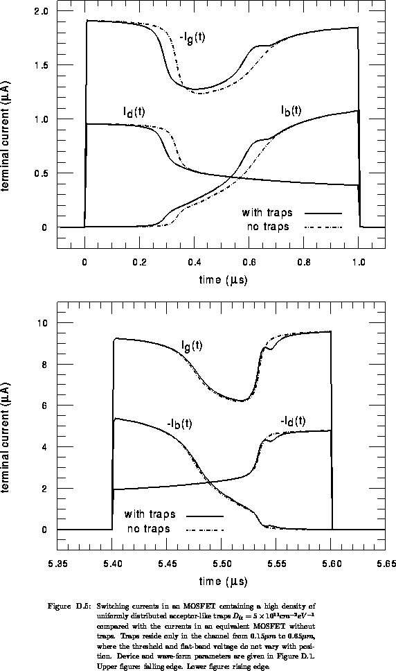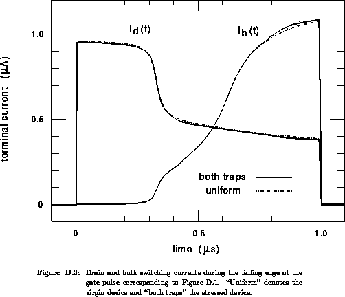 In order to better understand the transient processes in the stressed device against those in the virgin device, we calculate the switching currents for an equivalent device which contains high density uniformly distributed traps in the channel. In this device, the traps are removed away from the junctions; thereby, the signals are not influenced by the geometric effects discussed in 1. In addition, the terminal currents in an equivalent device which does not contain any traps are calculated as well. The results are shown in Figures D.5.