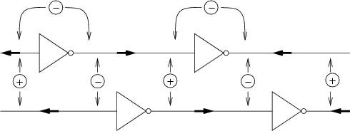 Für lange, globale Verbindungsleitungen kann die Zeitverzögerung auch durch Einfügen von Verstärkern reduziert werden. Auch die Signalform wird verbessert, allerdings zu Ungunsten der Packungsdichte und des Energieverbrauchs. Aufschluss über die Anordnung der Verstärker gibt beispielsweise [33]. Verstärker müssen am Beginn des Entwurfs geplant werden, damit im weiteren Verlauf auf sie zurückgegriffen werden kann. Eine weitere Möglichkeit zur Reduktion von Übersprechen ist das versetzte Einfügen von Invertern (Abb. 1.6). Die Inverter verursachen eine Änderung der Stromrichtung in jedem benachbarten Intervall. Die Selbstinduktivität wird auf der ganzen Leitung signifikant verringert [34], weil die induktiven Kopplungen zwischen den benachbarten Intervallen einer Leitung sich subtrahieren, statt wie üblicherweise addieren. Werden Inverterstufen jeder zweiten Leitung um den halben Abstand zwischen den Stufen versetzt, so kann auch die Gegeninduktivität zwischen benachbarten Leitungen deutlich verringert werden. Die Wechselwirkungen zwischen den Intervallen sind in Abb. 1.6 dargestellt.