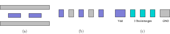 Kapazitives Übersprechen zwischen benachbarten Leitungen einer Ebene bzw. angrenzenden Ebenen kann durch Einführung von Masseflächen reduziert werden (s. Abb. 1.7a), was auch in einigen kommerziellen Mikroprozessoren angewandt wurde [35]. Leitungen mit großen Höhe zu Breite Verhältnissen lassen sich effektiver durch Schirmleitungen abschirmen (Abb. 1.7b), außerdem wird durch diese Schirmung auch eine Verringerung der Induktivitäten1.5 bewirkt, besonders die Gegeninduktivitäten