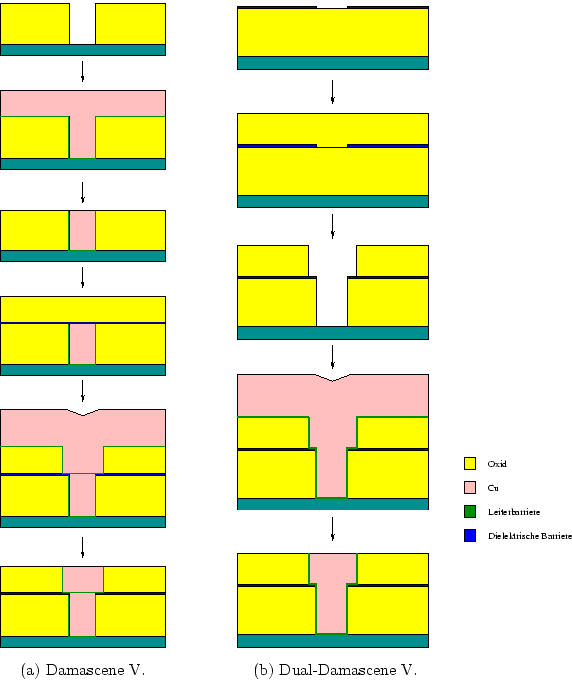 geätzt, Leiterbarriere und dann Cu aufgebracht, abschließend ein Metall CMP