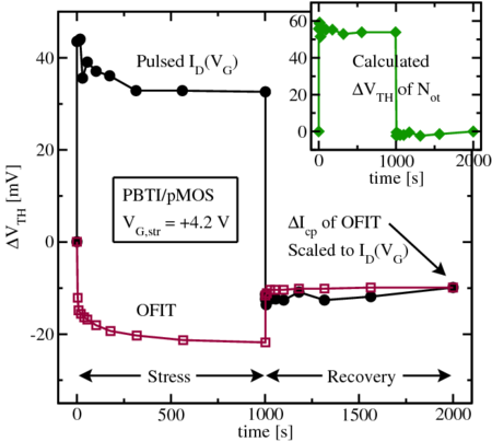 In the previous chapter various BTI stress tests were performed using the measurement-stress-measurement (MSM) and the on-the-fly (OTF) technique. Special attention was given to the fitting of the measurement data onto a universal relaxation law, yielding a separation of the degradation into a recoverable and a poorly recoverable or permanent component. Data gathered at different temperatures and stress voltages were found to follow a universal relaxation law. Interestingly both stress polarities, i.e. NBTI and PBTI stress on a pMOS, always resulted in a negative shift of the threshold voltage. Unfortunately, PBTI had been rarely discussed in literature until Liu et al. monitored a positive shift of the threshold voltage due to PBTI-stressed pMOS-devices [24], which contradicts the results presented by Grasser et al. [30].