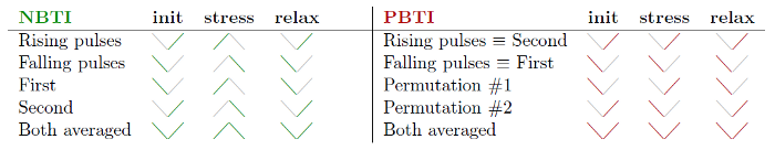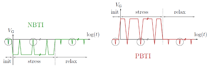 The pulse polarity differs for NBTI and PBTI during the stress phase. This