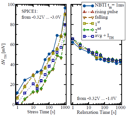 During relaxation the same pulse form is used for both NBTI and PBTI. Therefore the hystersis does not affect the extracted results. As expected, smoother results are obtained by averaging the pulses.