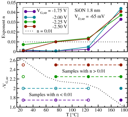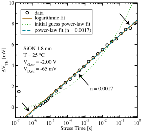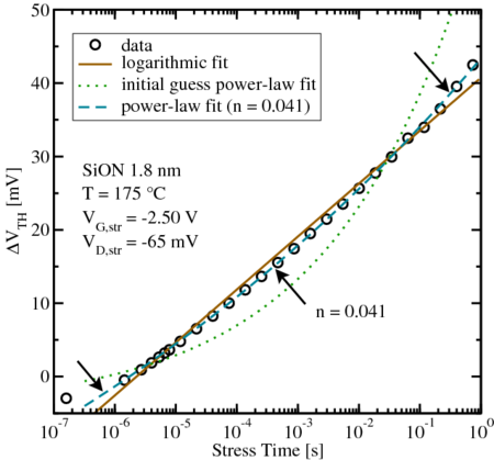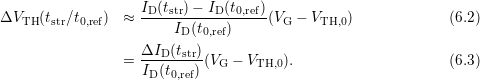 In contrast to Chapter 6.3, where the degradation of the drain current is directly fit by (6.1), the drain current is now first converted to an approximate threshold voltage shift using the simple OTF1 relation derived in Appendix A.1