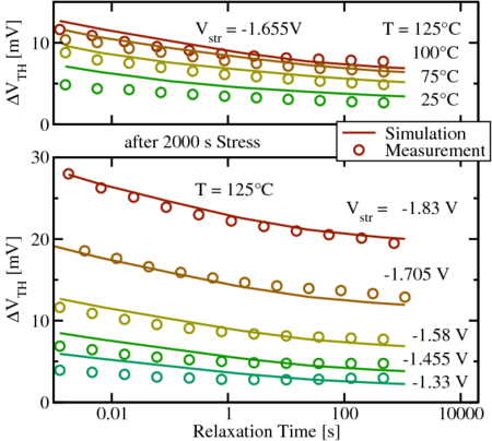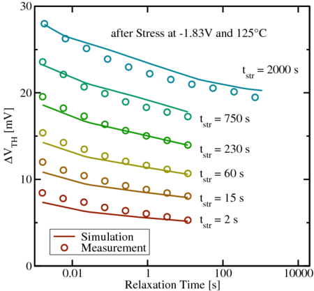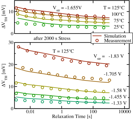 A further issue when dealing with device simulations was the already mentioned exactness of the distributions due to the different amount of taken defects. Here a number of 1000 representative defects exhibits a good compromise between computational efforts and accuracy of the simulation when fitting the experiments. Therefore this value is chosen for the calibration of the parameter set. When taking more defects into account, the simulation results become smoother and do not contain the small kinks, as visible in Fig. 9.10 for 1000 defects. However, this is only due to numerical reasons, since the actual degradation is always obtained by scaling the behavior of the “respresentative” defects. Consequently, the overall behavior is not changed, which can be seen when comparing Fig. 9.10 and Fig. 9.11.