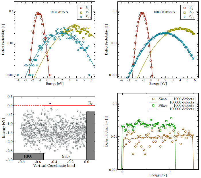 By chosing 1000 different defects a gaussian profile can already be well approximated, cf. Fig. 9.5 (top left). Further increasing the number of defects (top right) to 100000 yields a nearly perfect gaussian profile. The same numerical improvement is observed for the relaxation energies in Fig. 9.5 (bottom right). However, as will be shown later, a number of 1000 representative defects in a defect band, like depicted in Fig. 9.5 (bottom left), is sufficient to describe the measurement results properly.