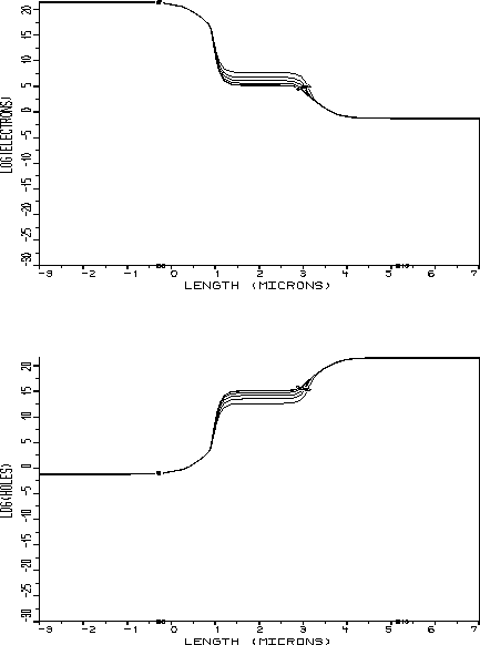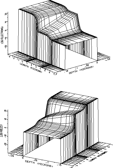 Abbildung: Elektronen- (oberes Bild) und Löcherkonzentration (unteres Bild)
