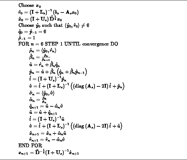 ,,Yet despite these impressive results, the convergence curves generated by CGS are frequently so erratic that it is hard to imagine that this algorithm can be completely right. We suspect an even better algorithm may be waiting to be discovered.``Das Verfahren ,,bikonjugierter Gradienten`` beruht auf dem nichtsymmetrischen Lanczos-Algorithmus [57][58]. Ähnlich dem CG-Verfahren wurde BiCG zur Lösung nichtsymmetrischer Gleichungssysteme wiederentdeckt [27]. Gemäß der ursprünglichen Idee von Lanczos konstruiert dieser Algorithmus rekursiv zwei Mengen von Vektoren, die wechselseitig bi-orthogonal sind. Die Algorithmus ist eine Bi-Orthogonalisierungsmethode und besitzt keine monotone Konvergenz. Eine besondere Schwierigkeit ist der sogenannte ,,Zusammenbruch`` des Algorithmus, wobei die Lanczos-Rekursion terminiert, ohne daß eine Lösung des Gleichungssystems erreicht wurde. Diese Eigenschaft hat den Algorithmus lange Zeit in Mißkredit gebracht. Jüngste Forschungen [28][29][30][78] deuten aber darauf hin, daß dieses Problem in fast allen Fällen vermieden werden kann.