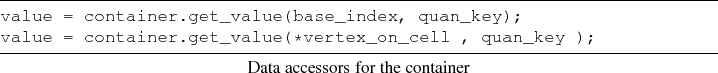 Separated by the fiber bundle approach, the stored data corresponding to the topological elements, such as vertices or edges, is available orthogonally by an element identifier, e.g., element number. During initialization, the quantity accessor q is bound to a specific domain with its quantity key. To access the underlying data, the operator() is evaluated with a vertex of the cell complex as argument and returns a reference to the stored value.