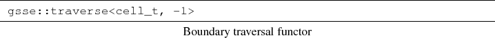 where cell_type_1 represents the base cell under consideration, whereas cell_type_2 specifies an incident sub-cell, e.g., a vertex or an adjacent cell. This mechanism can use virtually any derived internal structure of a cell or of the whole cell complex to build the requested traversal and avoids the construction and initialization specification. The following source snippet uses a given cell type and derives the boundary of this cell for traversal: