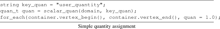 An important concept is the evaluation of quantities related to given topological elements. For example, the quantity storage of discretization schemes requires the evaluation and access of several different dimensional quantity types, e.g., the finite volume method uses edge distances and areas as well as vertex quantities. To create an automatic evaluation of these different types of quantity access, the GFL implements generic data accessors which represent a C++ function object. This means that this object implements, on the one hand, a mechanism for automatic type deduction, and, on the other hand, the operator(). In the following code snippet a simple example of the generic use of this accessor is given, where a scalar value is assigned to each vertex in a domain. The quantity accessor creates an assignment which is passed to the std::for_each algorithm.