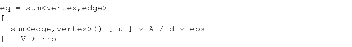 The heart of the equation is shown in the next code snippet. Here a sum is used as the discrete representation of the arithmetic operator. The topological traversal is given by the vertices incident to the edge. This inner part receives the edge information from the sum<vertex,edge> and builds a traversal on the vertices on this edge.