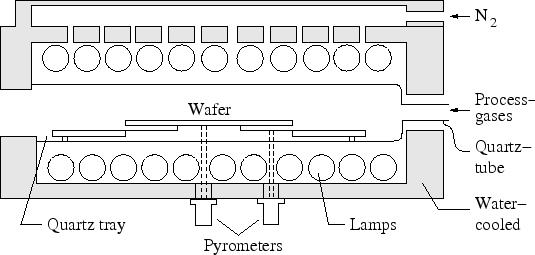 A schematic RTP system is shown in Fig. 2.6. The heat source is typically an array of lamps in an optical system. In contrast to conventional furnaces, where a batch of wafers is introduced into the furnace and oxidized at the same time, RTP systems are single-wafer machines, and only one wafer is in the chamber and processed. However, due to the high processing temperature (T > 900