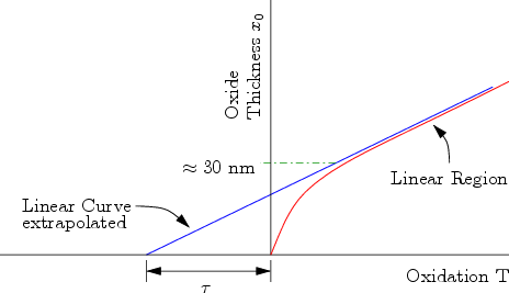 It has been observed in many experiments that there is a rapid and non-linear oxide growth in the initial stage of dry oxidation [54], as presented in Fig. 2.18. One weakness of the model is the impossibility to predict the initial stage of the oxidation growth. As shown in Fig. 2.18, even with the best fit, the approximately first 30 nm of the oxide thickness can not be forecasted with the linear parabolic model, because the oxide growth is fast and non-linear but the model offers only a linear fit for such thin thicknesses [55] .
