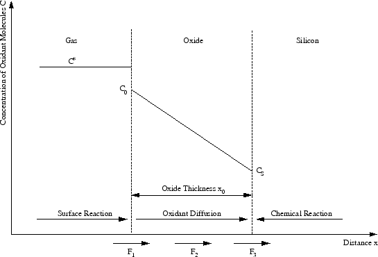 The third part of the oxidation process is the flux of oxidants consumed by the oxidation reaction at the oxide-silicon interface given by