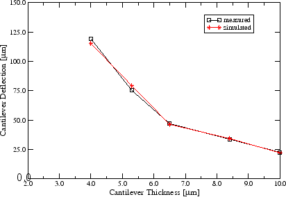 The main purpose of cantilever simulation is to predict the deflection for different geometries (e.g. length and thickness), mechanical boundary conditions, and deposition process parameters. In the following, fabricated cantilevers with a cross section as described in Section 9.4.1 are investigated.