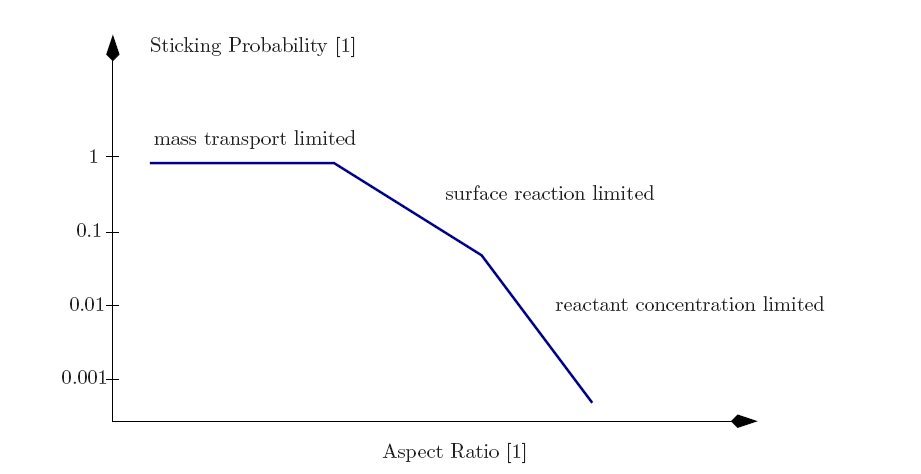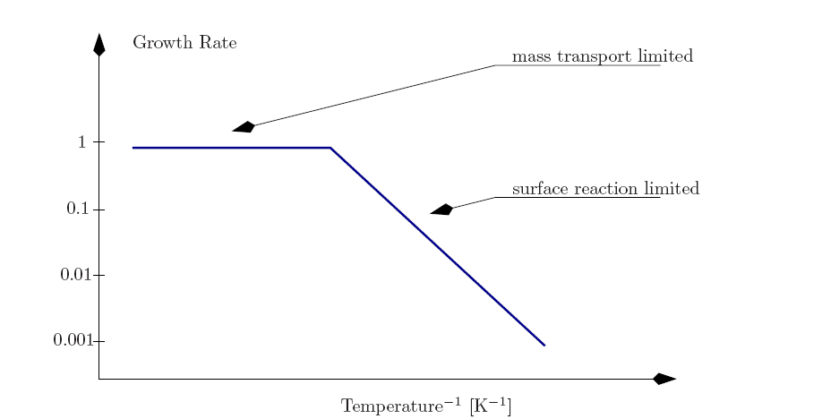 The type of the deposition can be classified into three major categories: a mass transport limited regime, a surface reaction limited regime, and a reactant concentration limited regime. As Figure 2.14 and Figure 2.15 depict, the mass transport and the surface reaction are influenced by the temperature, where all three limitations depend on the geometry. These regimes have different constraining factors which reduce the maximum deposition rate and thus the growth rate of the material in the reactor [127,25,165].
