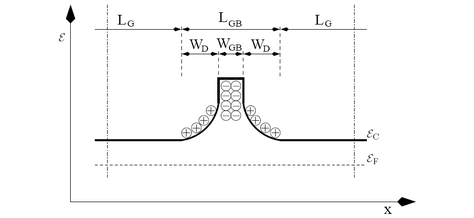 To account for this type of behavior, the polycrystalline structure has been considered for contacts in transistors where additional barriers occur besides the work-function difference [177,178]. This model can be applied to other material parts where polycrystalline Si appears, for instance in contacts [177]. Consequently, a model has been developed by MANDURAH and others, which accounts for these energetic barriers so as to derive a macroscopic model that can be calibrated if the necessary information is provided by measurements (cf. (3.3) and [179,180,181,177,178]). Based on this model NATHAN and BALTES propose in [79] to use the assumptions of MANDURAH from [179,180] and extend the grain boundary model by including an average-sized grain to obtain a more reasonable conductivity model.