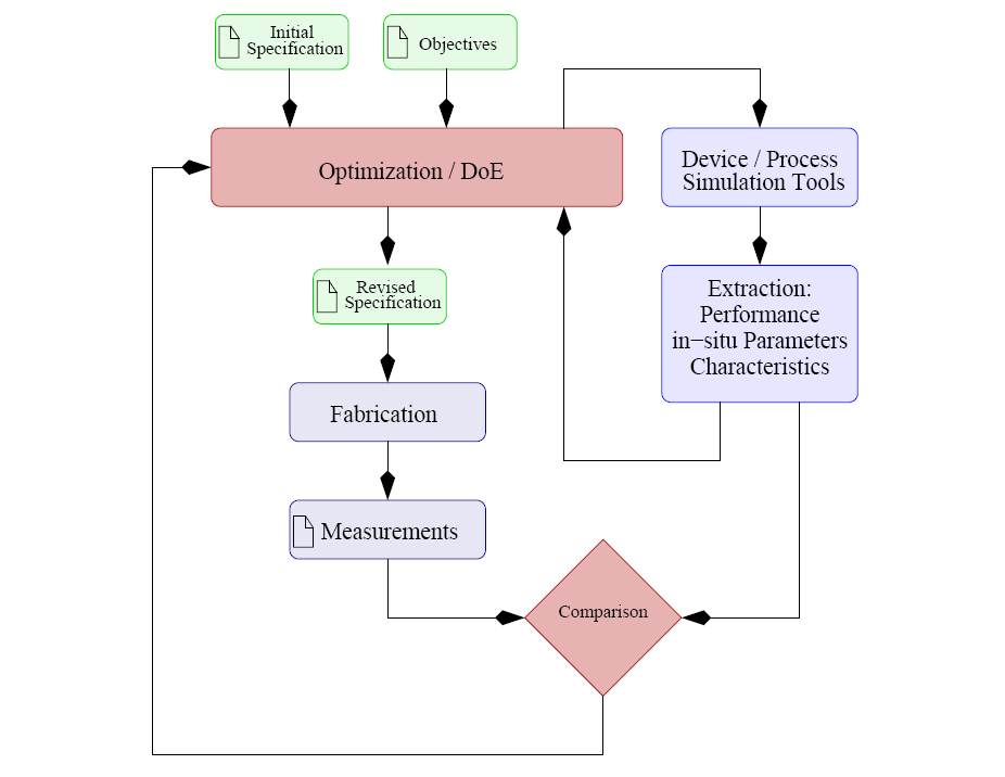 As depicted in Figure 4.2 the optimization loop can be involved at several levels of the design process. [234,235]. The first and fastest optimization loop is the one depicted on the left hand side of Figure 4.2. It shows the optimization with respect to the parameters of the models used in the process and device simulations. At the end of this optimization loop, the simulation results are compared with the reference data which can be certain figure of merits like guidelines or constraints or can be data obtained from measurements of real devices. The second optimization loop considers the fabrication process as well, where the process specification and the fabrication receipts are changed as the optimization procedure suggests by providing intermediate optimization results. However, design engineers have to verify the intermediate optimization results as well as final results because the obtained data set are numerical the best, but might be physically not reasonable, if for instance certain constraints cannot handle or determine the capabilities of the fabrication processes.