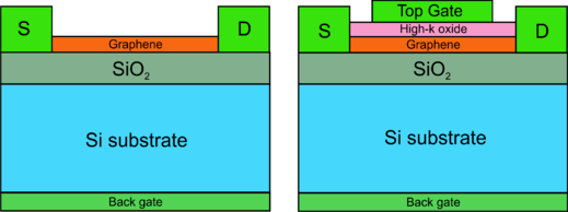 Depending on the device configuration, GFETs known from the literature are either back-gated [126, 82, 32, 74, 117] or top-gated [108, 112, 127, 98, 40], see Figure 4.5. In back-gated GFETs, the graphene channel is situated on top of the Si/SiO2 substrate (Figure 4.5(left)). Therefore, the SiO2 layer, which is obtained by thermal oxidation of Si [112, 82, 74, 117], serves as a gate insulator, while Si is employed as a gate electrode. The graphene channel is typically made by mechanical exfoliation on top of SiO2 [32] or by CVD [74], while the latter method leads to significant uniformity of the film [74]. The source/drain electrodes (e.g. TiAu) can be created by using electron-beam lithography followed by a lift-off process [117]. Also, for convenience during measurements, a metallic electrode connected to a Si substrate can be added. However, back-gated devices are quite complicated for integration into circuits, and their performance is limited by large parasitic capacitances and the detrimental impact of the environment on the non-covered graphene layer [117]. Therefore, they are mostly suitable for use as test benches when investigating the carrier transport processes in graphene. Thus, devices required for circuit applications have to be equipped with a top gate.