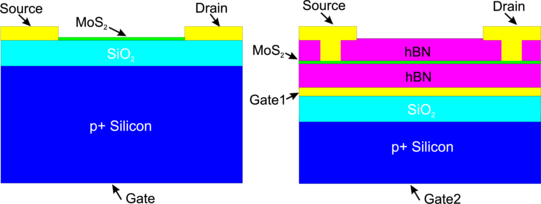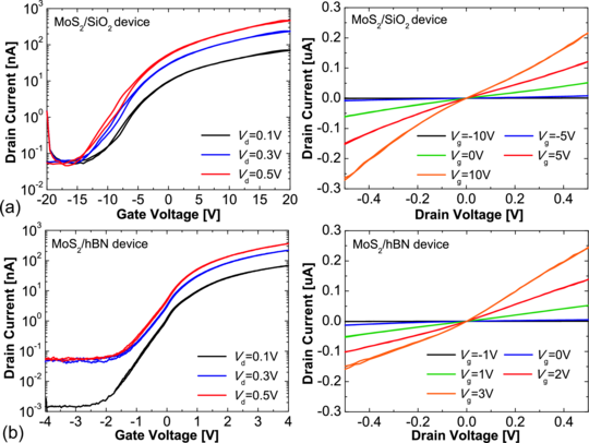 We examine single-layer MoS2 FETs with SiO2 and hBN as a gate insulator fabricated by our collaborators at Prof. Mueller’s group [47]. The channel length of these devices is around 1μm, while the width for different FETs can vary between 4μm and 8μm. In our MoS2/SiO2 devices (Figure 7.1(left)) a MoS2 channel is situated on top of a 90nm thick SiO2 layer. In the second transistors, MoS2 is sandwiched between two 90nm thick hBN layers (Figure 7.1(right)). In order to allow for a more detailed analysis of hBN vs. SiO2, we added an additional Ti/Au gate between the hBN and the SiO2 layer. Thus, we can operate these devices either with a hBN gate insulator when contacting the Ti/Au plate or with a hBN/SiO2 stack through the highly doped Si substrate.