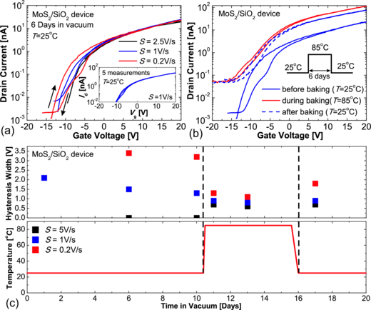An initial check of our MoS2/SiO2 devices shows that the Id-V g characteristics exhibit some hysteresis even after several days in a vacuum at T = 25∘C. While being reproducible at a constant sweep rate, similarly to [101], this hysteresis becomes larger when S is decreased (Figure 7.3a). When the temperature is increased to 85∘C, the drain current increases (Figure 7.3b). At the same time, the hysteresis width ΔV H measured using a very small S significantly decreases. However, when after six days the temperature is changed back to 25∘C, both drain current and hysteresis width show only insignificant trends toward their initial values. Hence, after baking, the device exhibits better performance in terms of both Id and ΔV H. The evolution of the hysteresis for our MoS2/SiO2 devices at different S versus time in the vacuum and temperature is shown in Figure 7.3c. During the first 10 days at T = 25∘C, a large hysteresis was observed for small S, while being reduced versus time in the vacuum. At the same time, no significant hysteresis was present when using fast sweeps. However, when increasing the temperature to 85∘C, ΔV H measured with small S was significantly reduced, while a considerable hysteresis appeared for large S. Back at 25∘C, some increase in hysteresis width measured with small S is pronounced. However, ΔV H did not return to its initial values. This implies that in our MoS2/SiO2 FETs, baking anneals a considerable fraction of slower traps, while also introducing some faster traps. Most likely, slower traps are associated with water molecules [101], which can be evaporated from an uncovered MoS2 surface either during a long time in the vacuum or at higher temperatures. Obviously, in the latter case, annealing of these traps is more intensive, leading to a larger decrease in ΔV H.