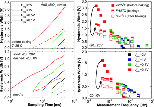 We proceed with a detailed analysis of the dependence of the hysteresis width versus sweep rate for our MoS2/SiO2 devices. In Figure 7.4 (left) the dependences of ΔV H versus tstep and V step for different voltage sweep intervals V gmin…V gmax and temperatures are shown. Clearly, in all cases ΔV H increases for larger tstep and smaller V step, i.e. smaller S=V step/tstep. By introducing the measurement frequency f=1/(Ntstep) with the number of points N=2((V gmax-V gmin)/V step+1), we demonstrate in Figure 7.4 (right) that the obtained experimental points form a universal frequency dependence of ΔV H. This behaviour depends strongly on T at low frequencies, confirming that slower traps disappear during baking. For higher frequencies, the dependence becomes more pronounced during and after baking, suggesting that defects with smaller capture times become active. Interestingly, the same trends are observed independently of the sweep range, although ΔV H becomes smaller for narrower sweep ranges (cf. [110]). Thus, in our MoS2/SiO2 FETs the temperature treatment reduces the amount of slower traps and activates faster traps.