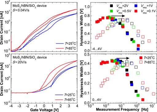 In Figure 7.5 we show the transfer characteristics measured at different S and temperatures, and ΔV H(f) dependences for MoS2/hBN/SiO2 device. Similarly to MoS2/SiO2 devices, ΔV H measured using a small S is reduced at higher temperatures, while the fast sweep hysteresis becomes significantly larger. However, the hysteresis is pronounced up to larger S, which suggests the existence of a larger contribution of faster traps compared to MoS2/SiO2 devices. The resulting frequency dependence contains a maximum of ΔV H, which shifts towards higher frequency at T = 85∘C. As such, the temperature dependence is similar to MoS2/SiO2 FETs. Figure 7.6 shows the related results for MoS2/hBN devices. Contrary to the previous two cases, the hysteresis is not present at very small S and can be observed only when using extremely fast sweeps. The frequency dependence confirms that the hysteresis in hBN devices is dominated by ultra-fast traps, while the contribution of slower traps is negligible. Hence, the maximum of ΔV H is most likely at even higher frequencies outside our measurements range. Also, an increase in ΔV H at T = 85∘C is visible for wider sweep range.