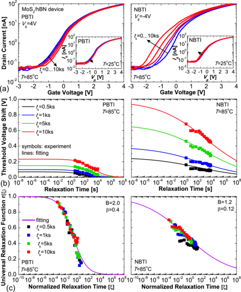 We proceed with an analysis of the degradation/recovery dynamics in MoS2/SiO2 FETs at different temperatures. Figure 7.9 shows the results obtained using subsequent PBTI stress/recovery cycles with increasing ts. In order to compare the BTI degradation/recovery dynamics with Si technologies, we use the universal relaxation model [61, 64]. All recovery traces for our MoS2/SiO2 devices can be reasonably fitted (Figure 7.9b), since the normalized recovery is universal (Figure 7.9c). Just like in Si technologies, stronger degradation and faster recovery are observed at higher T, which is due to the thermally activated nature of carrier trapping [57]. However, MoS2 FETs are known to exhibit both PBTI and NBTI on the same device [26, 193]. The related results for NBTI in MoS2/SiO2 FETs are provided in Figure 7.10. While V th is shifted in the opposite direction, the observed shifts are larger than for PBTI. This is likely due to a difference in the energy levels of the involved traps. Nevertheless, the recovery traces can be well fitted by the universal relaxation model, which confirms a similarity of the two phenomena. Moreover, the temperature dependence of NBTI degradation is similar to PBTI. Namely, stronger shifts and faster recovery are observed at T = 85∘C.