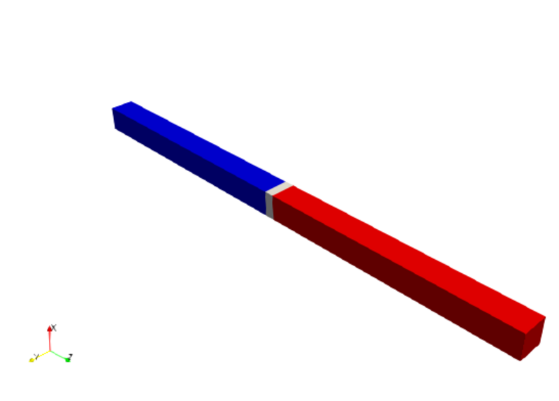 To validate the effective interface layer approximation, the CIP NM/FM bilayer system from Section 6.2.4 is again considered. To compare directly with the analytical solution, the 3D weak formulation must be reduced to one dimension. This is achieved by limiting the spin polarization and spin Hall spin currents in the linear form to the \(z\)-direction, i.e., \(\bm {m}\otimes \bm {j_c} \to 0\) and \(\varepsilon \bm {j_c} \to \bm {\hat {y}}\otimes \bm {\hat {z}}j_{cx}\) for a current along the \(x\)-axis in the left-hand-side of Eq. (6.56). Furthermore, a quasi-1D mesh of the bilayer system is used, as shown in Fig. 6.9.