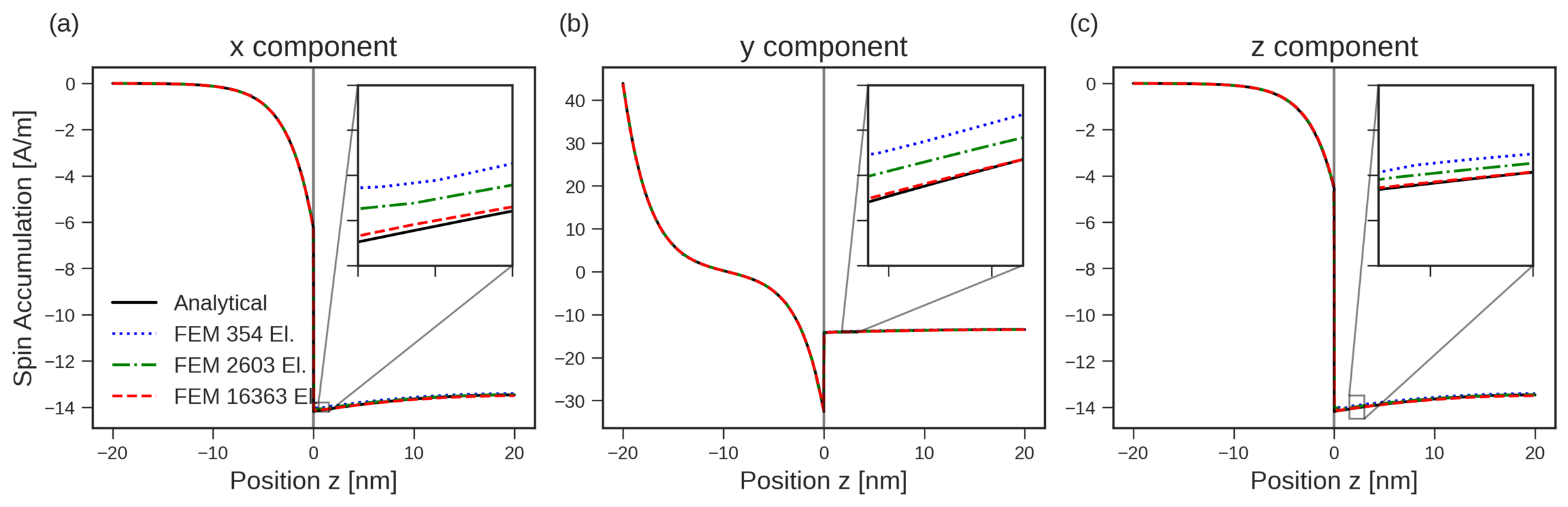 Figure 6.11 shows the comparison of the FEM and analytical solutions for the spin accumulation in a NM(20 nm)/FM(20 nm) bilayer system with a fixed spin dephasing length \(\phi = 0.1\) nm and an increasingly refined mesh. The effective interface layer is subtracted from the presented solution. The FEM solution shows good agreement for all the meshes. By zooming in on the solution, it can be seen that the FEM solution converges to the analytical solution as the mesh is increasingly refined.