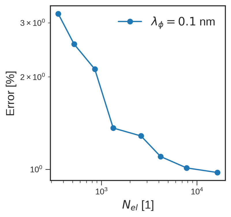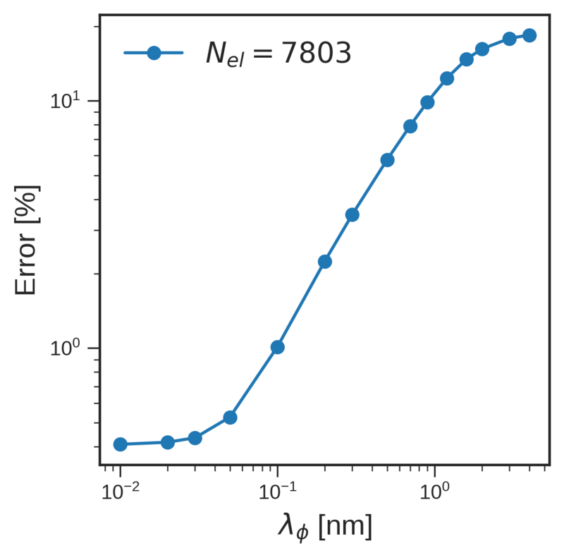 Figure 6.12 shows the NMAE between the FEM and analytical solutions as a function of the number of elements for a fixed spin dephasing length of \(\lambda _\phi = 0.1\,\mathrm {nm}\), and as a function of the spin dephasing length for a fixed number of elements \(N_\mathrm {el} = 2603\). Both figures show that a good convergence of the FEM solution to the analytical solution is achieved when the number of elements is increased or when the spin dephasing length is decreased.