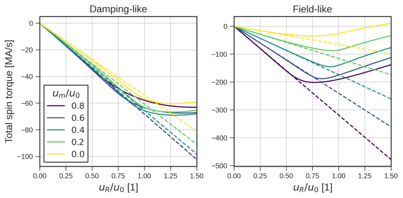 The IRPT-BCs assume that the Rashba SOC is small compared to other interactions, allowing it to be treated as a perturbation of the wave function. Consequently, these boundary conditions are expected to break down for large Rashba coupling strengths. To assess the validity range of this perturbative approach, the total spin torque acting on the magnetization in the bilayer system is computed for increasing \(u_R\). The total torque is obtained by integrating the torque density over the FM layer and dividing by its thickness. Figure 7.7 presents the resulting torques computed with the 1D-CSDD solver using both the IMR-BCs and IRPT-BCs.
