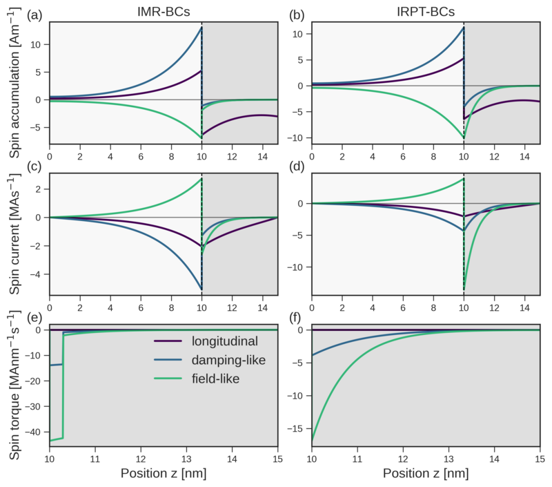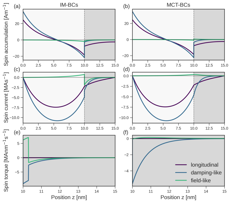 For the MCT-BCS, the spin currents are kept continuous across the interface and are related to the spin and charge potential drops through the interface conductances. In contrast, the IM-BCs allow for the spin current to be discontinuous across the interface by introducing a transmission mixing conductance, thereby capturing the absorption of transverse spin current due to the exchange interaction at the interface. The solutions are projected along the DL, FL, and longitudinal directions. The magnetization is oriented along \((1,1,1)\) such that all the components are non-zero, and the spin-flip length in the FM is set to \(3\,\mathrm {nm}\) to highlight the decay of the longitudinal component. To visualize the interface torque, it is included as a step function in the FM layer in the vicinity of the interface.