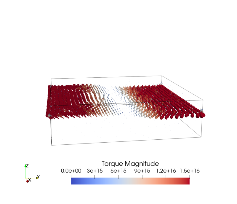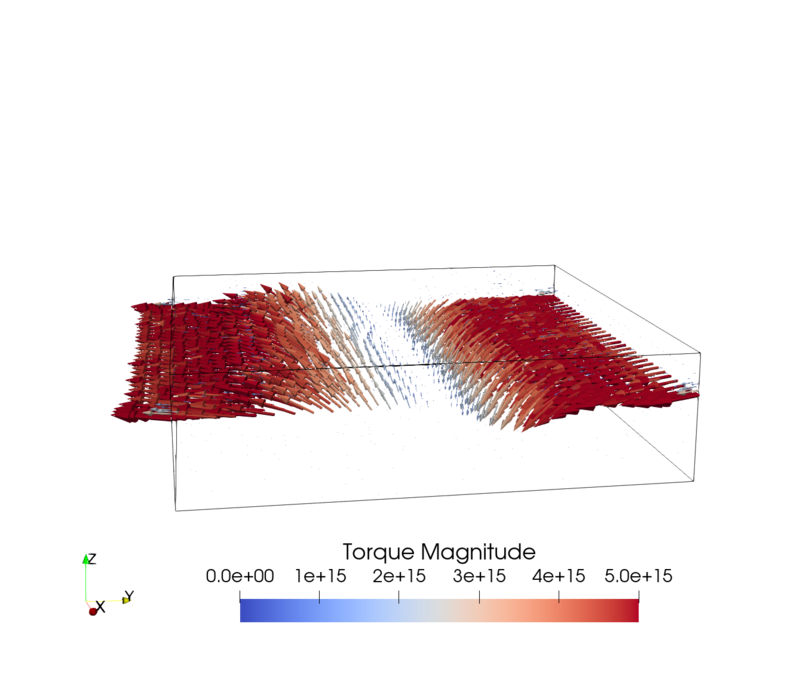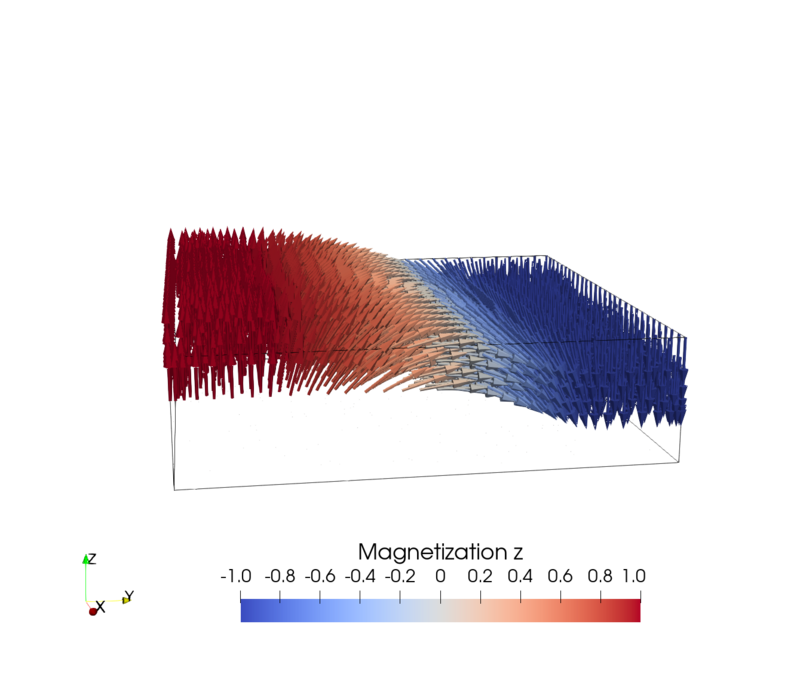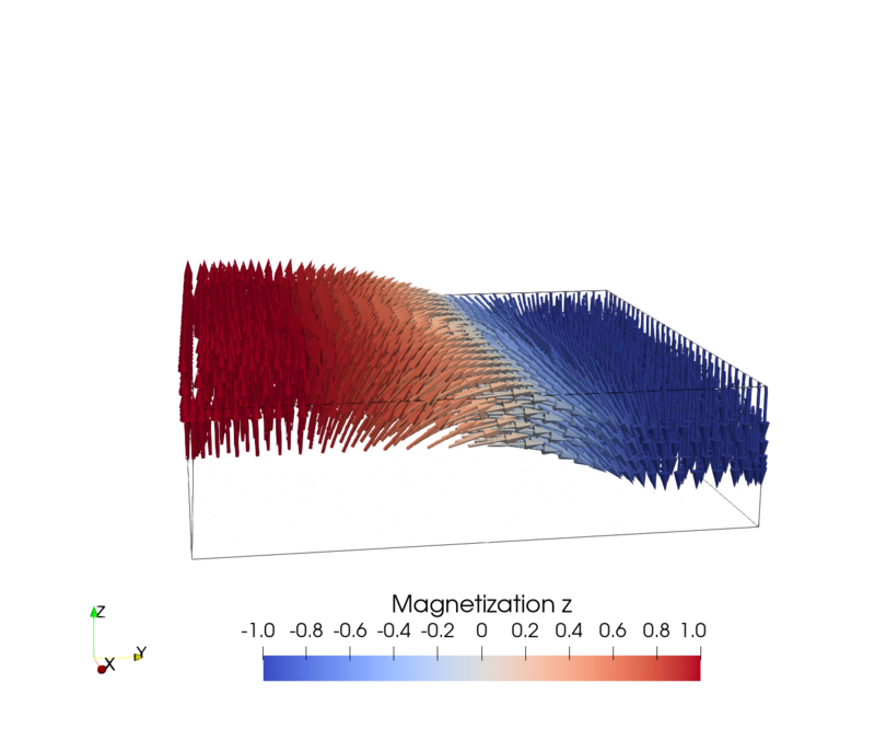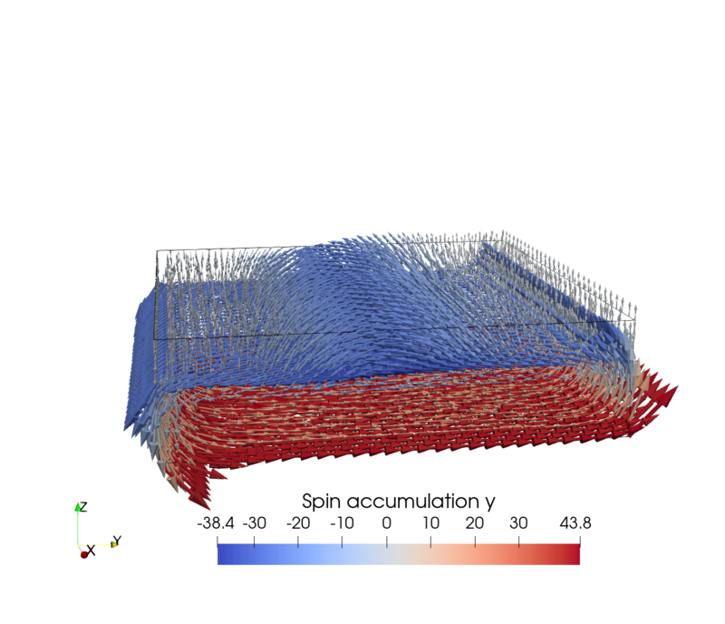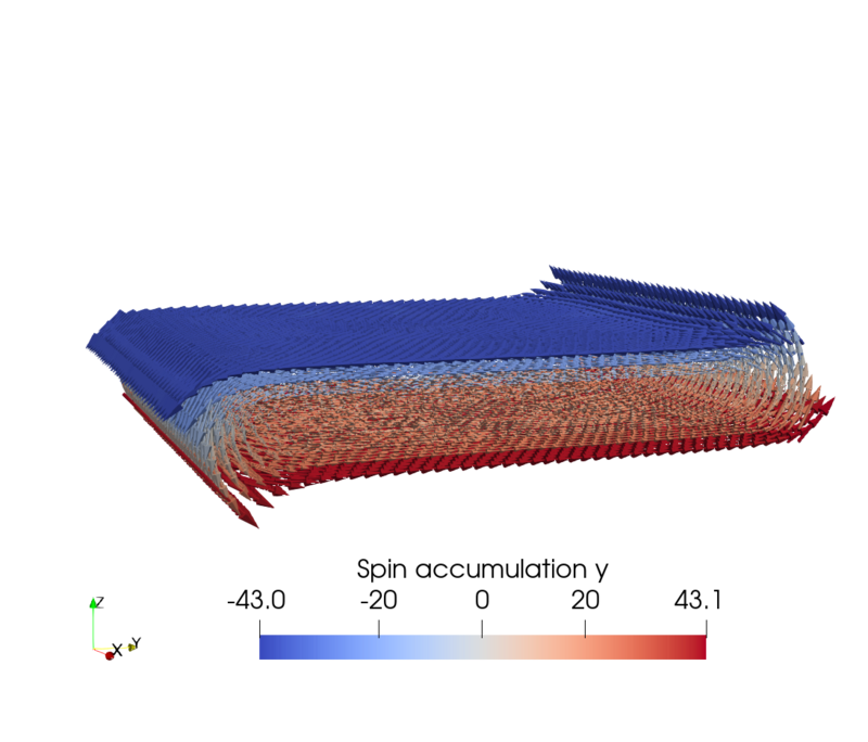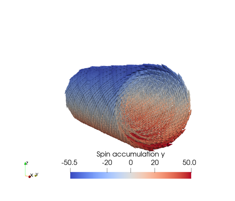 Considering a NM wire with an in-plane electric field, the SHE generates a spin accumulation at the interface of the wire with a polarization perpendicular to the current and the interface normal. Figure 7.1 shows the spin accumulation generated by the SHE in a cylindrical and rectangular wire, respectively, computed with the FEM solver using the parameters presented in Table 6.1 with an applied electric field of \(10^{6}\,\mathrm {V/m}\) along the \(x\)-direction. The cylindrical wire has a radius of \(10\,\mathrm {nm}\) and the rectangular wire has a width of \(60\,\mathrm {nm}\) and a thickness of \(10\,\mathrm {nm}\). As expected, the polarization direction of the spin accumulation at the boundary is described by the cross product \(\bm {\hat {p}} = \bm {\hat {E}}\times \bm {n}\), where \(\bm {n}\) is the interface normal. Thus, in the cylindrical wire, the spin accumulation wraps around the outer edges of the wire, whereas in the rectangular wire, it is uniformly aligned along the long sides and changes direction around the edges. In both cases, the spin accumulation at the upper part of the boundary of the wire is polarized along \(-y\).