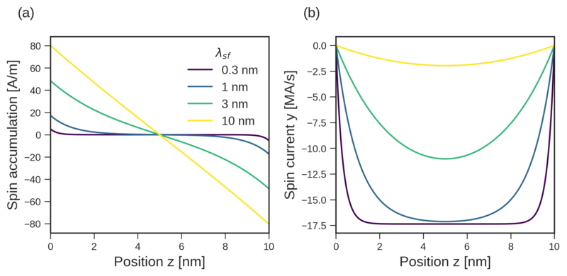 Assuming the length and width of the rectangular wire are much larger than the thickness, the drift-diffusion equations can be simplified to a 1D problem. Figure 7.2 shows the spin accumulation and spin current density generated by the SHE, computed with the 1D-CSDD solver for various spin-flip lengths. For longer spin-flip lengths, less of the net spin density generated in the bulk is lost to spin-flip scattering before reaching the boundary. Thus, longer spin-flip lengths result in an increasing build-up of spin accumulation at the boundary of the wire. At the boundary, the spin current is reflected, resulting in a diffusion spin current flowing back into the bulk, opposing the SHE-generated spin current. The reflected spin current penetrates deeper into the bulk for longer spin-flip lengths, resulting in a larger region where the net spin current is reduced. The distribution of the spin accumulation shows qualitatively good agreement with the first reported experimental observation of the SHE in GaAs [37].