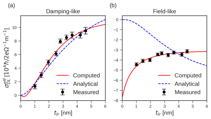 Figure 7.9: The Ir thickness dependence of the DL (a) and FL (b) effective spin torque conductivities for an Ir(\(t_\mathrm {Ir}\))/CoFeB(\(2.3\,\mathrm {nm}\)) bilayer structure with an in-plane current and magnetization