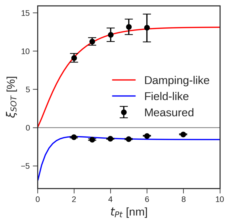 Pt(\(t_{Pt}\))/CoFeB(\(3\,\mathrm {nm}\))/MgO(\(1\,\mathrm {nm}\)) and W(\(t_{W}\))/CoFeB(\(1\,\mathrm {nm}\))/MgO(\(1\,\mathrm {nm}\)) bilayer systems are shown in Figures 7.10 and 7.11, respectively. The data for the FL torque in W/CoFeB was renormalized to the current