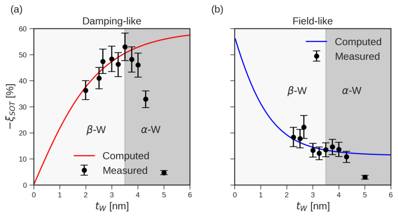 Figure 7.11: Thickness dependence of the W(\(t_{W}\))/CoFeB(1 nm)/MgO(1 nm) DL (a) and FL (b) spin torque efficiencies. The experimental data were taken from [101]. The fit was achieved using the 1D-CSDD solver