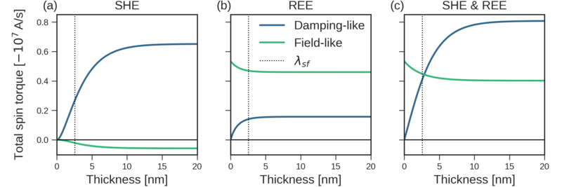 The SHE generates a predominantly DL torque, while the RE produces a strong FL torque. In experimental systems, however, it is challenging to separate the two effects and determine their relative contributions to the SOTs as