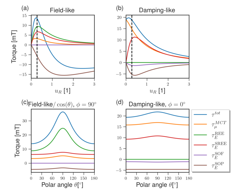 The individual contributions to the total spin torque captured by the 3D scattering model as a function of the Rashba interaction strength \(u_R\) are shown in Fig. 7.15a-b. As expected, in the limit of vanishing SOC, the additional in-plane current contributions disappear, leaving only the MCT contribution from the bulk SHE-generated spin accumulation. In contrast to conventional 2D REE models and the perturbation theory approach, the in-plane current contributions in this model do not scale linearly with \(u_R\). Instead, most contributions reach a maximum near \(u_R \approx u_m\) (except the SOP) and subsequently decrease in magnitude as \(u_R\) increases. The reduction originates from the increased lattice torque at the interface, which consistently reduces the MCT contribution \(\tau _\mu ^{\mathrm {MCT}}\) through spin-memory loss of the incident SHE current with increasing \(u_R\). The SOC-driven contributions initially grow with \(u_R\) as in-plane currents are more efficiently converted into out-of-plane spin currents. They reach their maximum near \(u_R \approx u_m\), where interfacial precession around the magnetization most effectively generates transverse spin components. For larger \(u_R\), the lattice torque begins to dominate, while transmission is strongly suppressed and reflection is enhanced as the potential barrier surpasses the Fermi energy. Consequently, the SOP contribution, which relies only on spin-dependent reflections, dominates the FL torque for \(u_R > u_m\) and peaks near \(u_R \approx 1.5u_m\). The decomposition further shows that the SOF contributes exclusively to the DL torque, while the SOP contributes to both DL and FL torques, with both terms opposing the other torque contributions. Consistent with 2D models, the REE produces only a FL torque; however, the SREE contributes to both components and constitutes the dominant contribution to the DL torque aside from the MCT term. Figures 7.15c-d illustrate the angular dependence of the different torque terms, which exhibit qualitatively similar trends with varying strength. In particular, the REE is found to be primarily responsible for the strong angular dependence of the FL torque magnitude, while the MCT torque also acquires an angular dependence through SOC-induced modifications.