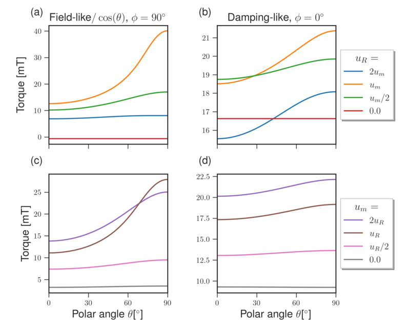 To examine the respective roles of Rashba SOC and the magnetic exchange interaction at the interface, the angular dependence of the SOTs is calculated for different values of \(u_R\) and \(u_m\) using the Co/Pt parameters from the previous section. The resulting SOTs are shown in Fig. 7.14. Both the FL and DL torques exhibit a strong dependence on the interaction strengths. The FL torque displays the largest magnitude and most pronounced angular variation when the interfacial SOC and magnetic exchange interactions are comparable. For either stronger or weaker relative interaction strengths, both the angular dependence and the magnitude are reduced. The DL torque exhibits a similar trend, but reaches its maximum when \(u_m > u_R\). In the limiting cases where either \(u_R = 0\) or \(u_m = 0\), the angular dependence of both FL and DL torques vanishes.