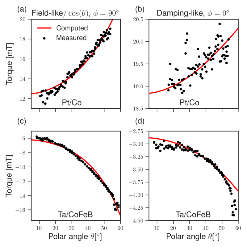 Experimental measurements of the angular dependence were also reported for a Ta(\(3.0\,\si {nm}\))/CoFeB(\(0.9\,\si {nm}\)) bilayer with a MgO(\(2.0\,\si {nm}\)) capping layer [113]. For this system, the resistivity was measured as \(184\,\si {\micro \ohm \centi \meter }\), and with a current of \(500\,\si {\micro \ampere }\) applied to a sample of width \(1\,\si {\micro \meter }\), the in-plane electric field is estimated to be \(15.7\,\si {\mega \volt \per \meter }\). Figure 7.13c,d presents the best fit obtained using the bulk and interface parameters summarized in Tables 7.4 and 7.5, respectively, together with a CoFeB saturation magnetization of \(M_s \approx 810\,\si {\kilo \ampere \per \meter }\) [121]. The fit reproduces the experimental data well, except for the DL torque at both small and large polar angles. In this system, the FL torque dominates and shows a strong angular dependence. Unlike the Pt/Co system, both torque components appear with opposite sign, consistent with the negative spin Hall angle of Ta and the fitted Rashba SOC magnitude.