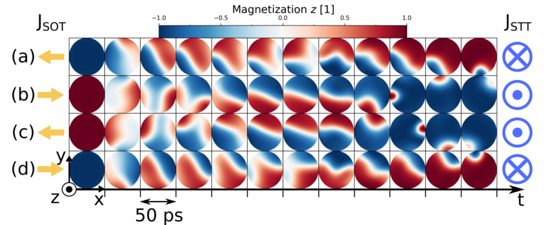 pulse is applied. The four possible switching modes (a-d) are shown, where the yellow and blue arrows indicate the direction of the SOT pulse and the STT pulse, respectively.