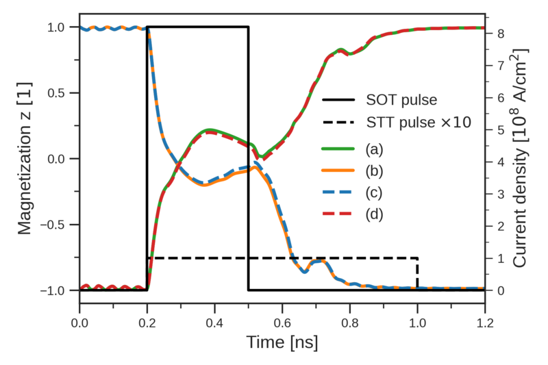 through the MTJ in addition to the current pulse through the NM layer. This approach was first studied in the mid-2010s by evaluating the LLG equation [146, 147], and later demonstrated experimentally in 2018 by Wang et